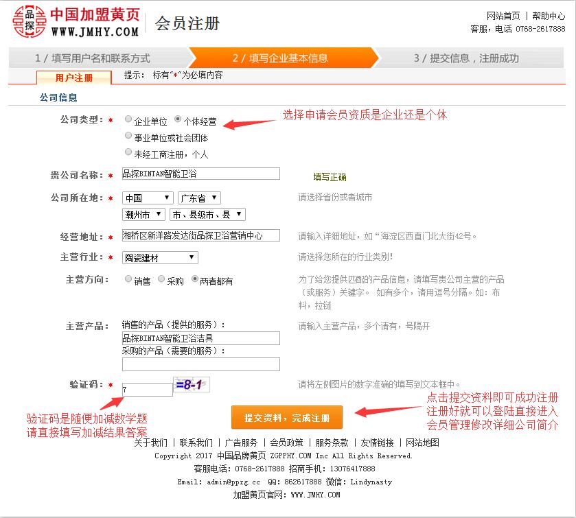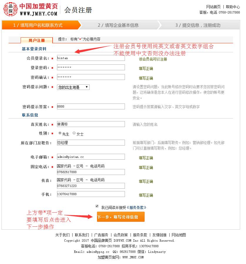 输入访问中国品牌黄页官网www.jmhy.com 顶部有“免费注册”点击进入下图按里面要求填写即可