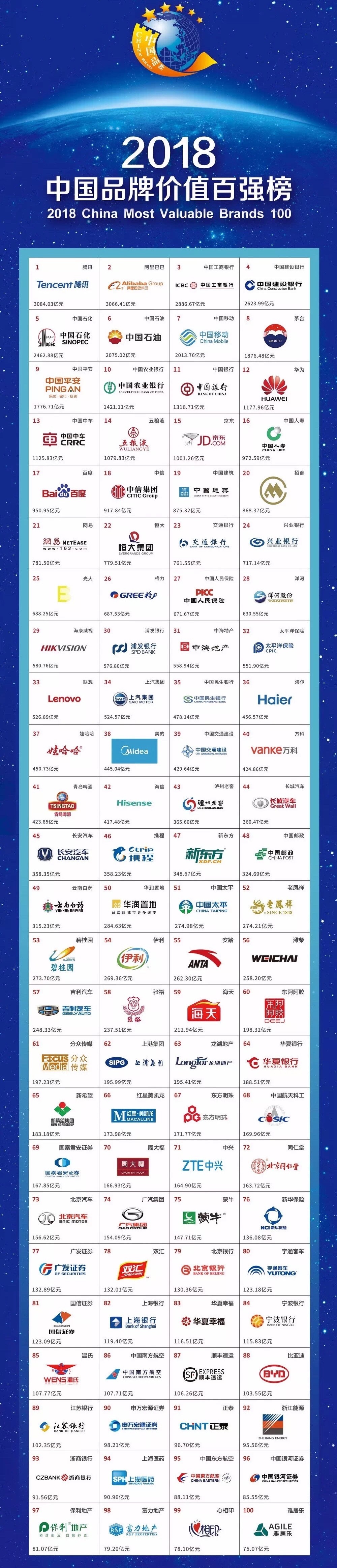 由中国品牌建设促进会、经济日报社、中国国际贸易促进委员会、中国资产评估协会等单位联合举办的“2018中国品牌价值评价信息发布”活动在上海举行,活动首次发布了2018年中国品牌价值百强榜,上榜品牌总品牌价值高达56578亿元。